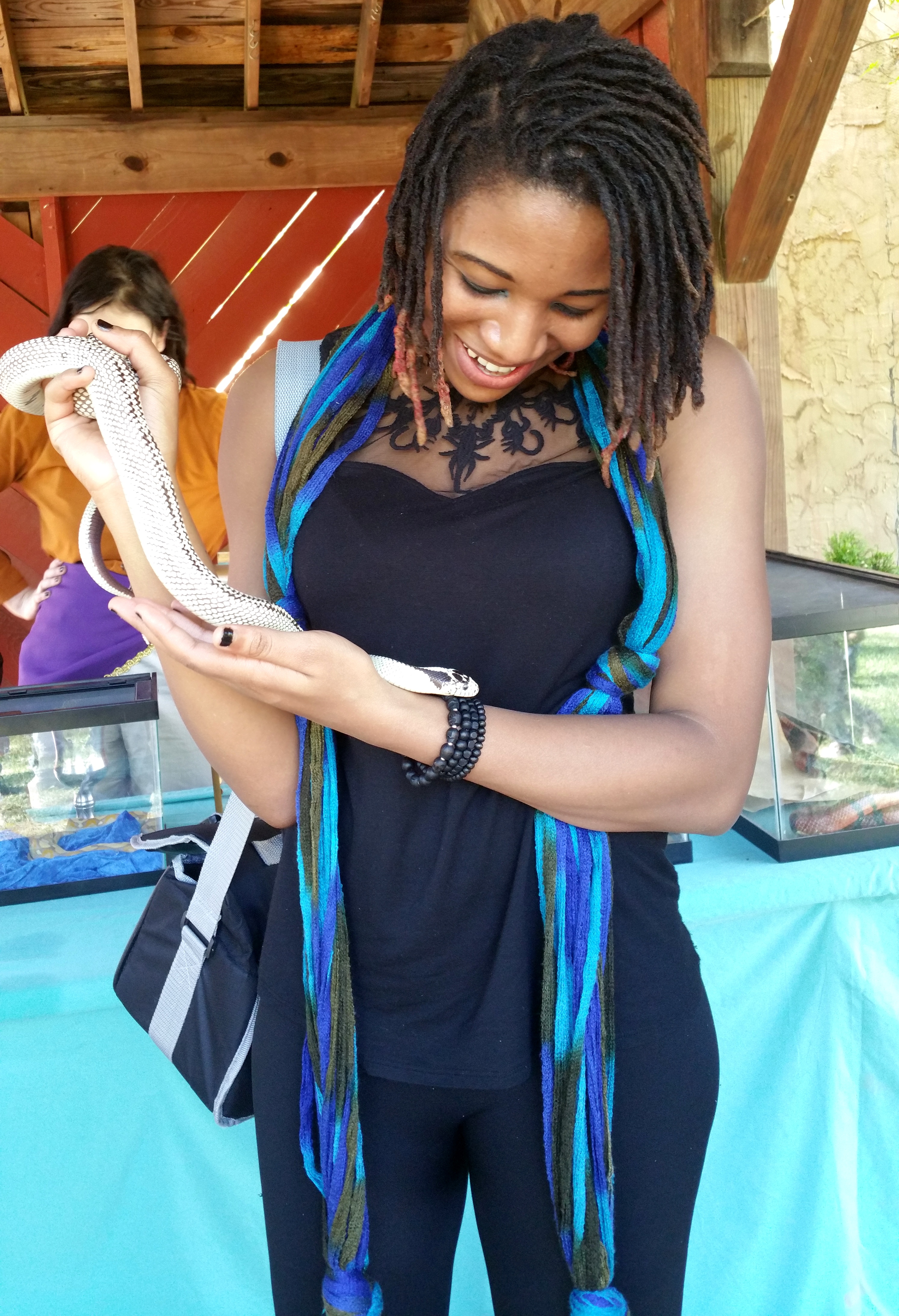 I wish I had gotten the man’s name, because he definitely played an instrumental role in calming me enough to take the snake. Amazingly, it immediately took a liking to me. So much so that when I shared him with another girl, he came slithering right back to me.